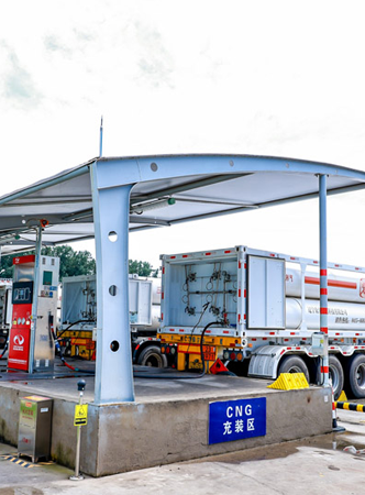 CNG充裝區(qū)配備高效加氣柱,站內(nèi)設(shè)施設(shè)計(jì)日充裝能力達(dá)115萬立方米。天然氣經(jīng)過精密調(diào)壓、脫水及壓縮工藝處理后,通過專業(yè)CNG槽車完成充裝與加注,服務(wù)覆蓋工業(yè)與車用燃?xì)馐袌?chǎng)。